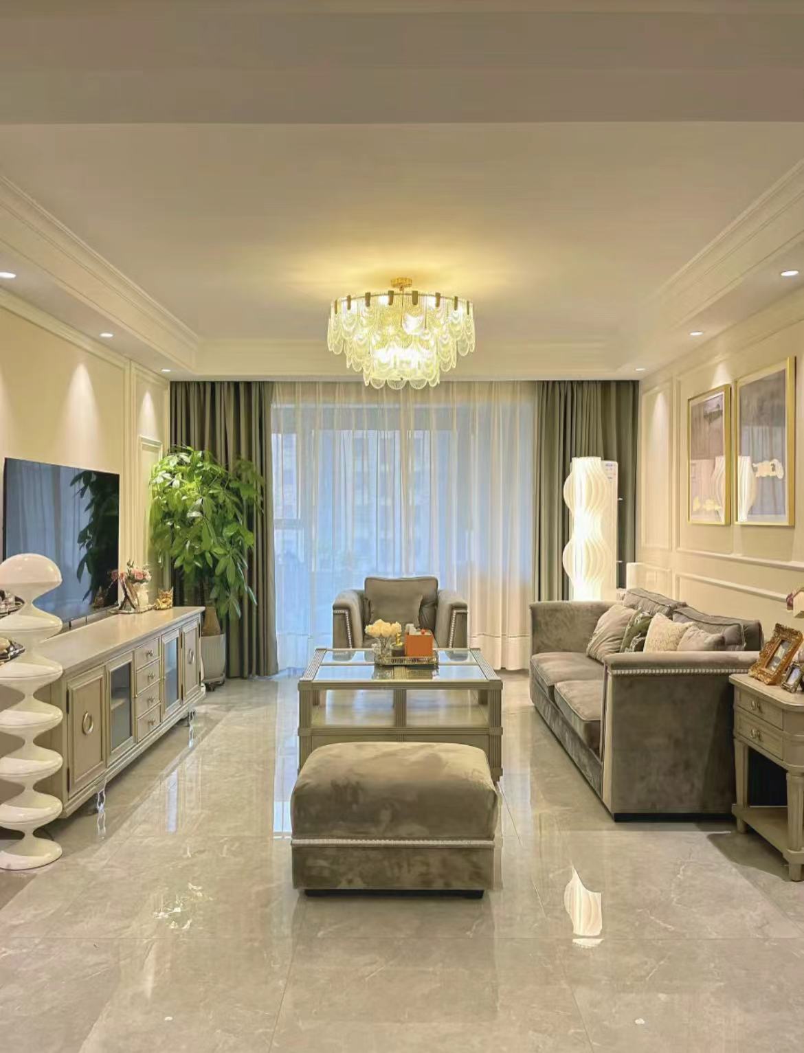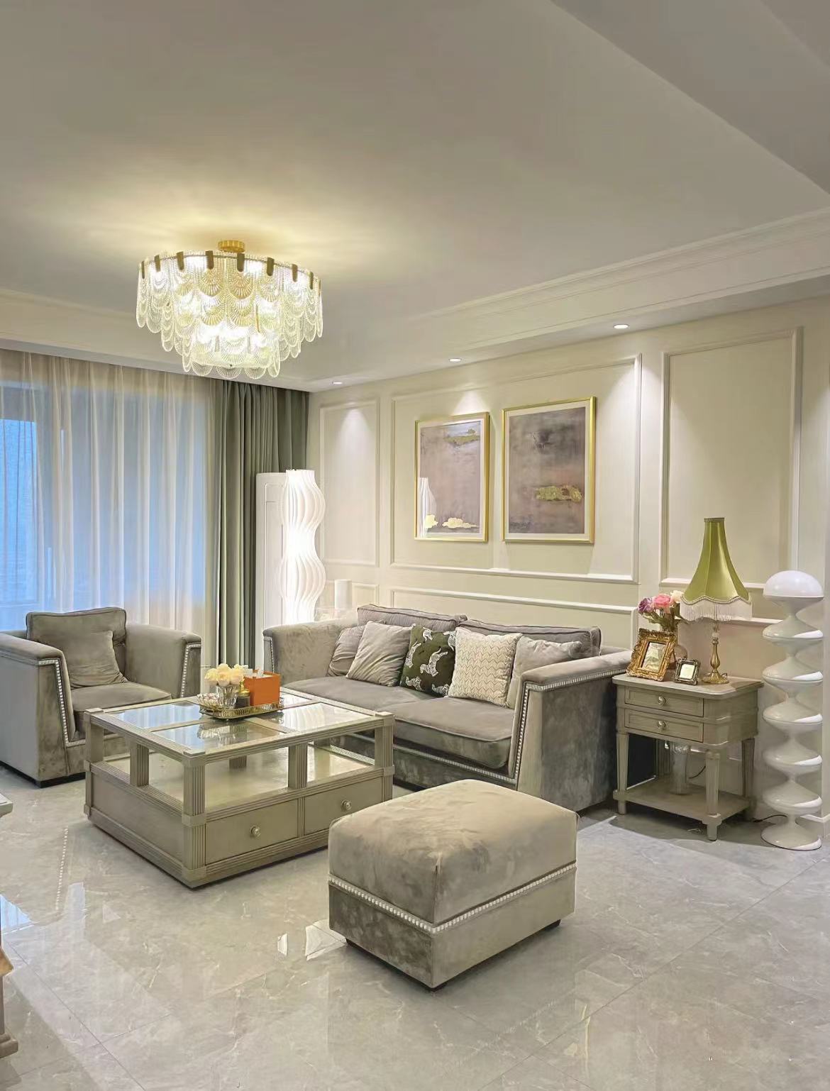 比起传统欧式过度追求的华丽感,轻欧式的改良出现,反而更具有优雅舒适的感觉,墙面刷的是奶油色,规整简约的石膏线,让墙面不会显得过于空阔,浅灰的沙发与四 方茶几,给这个空间带来内敛和冷静。而丝绒的细腻质地加成,更显得高级奢华。
